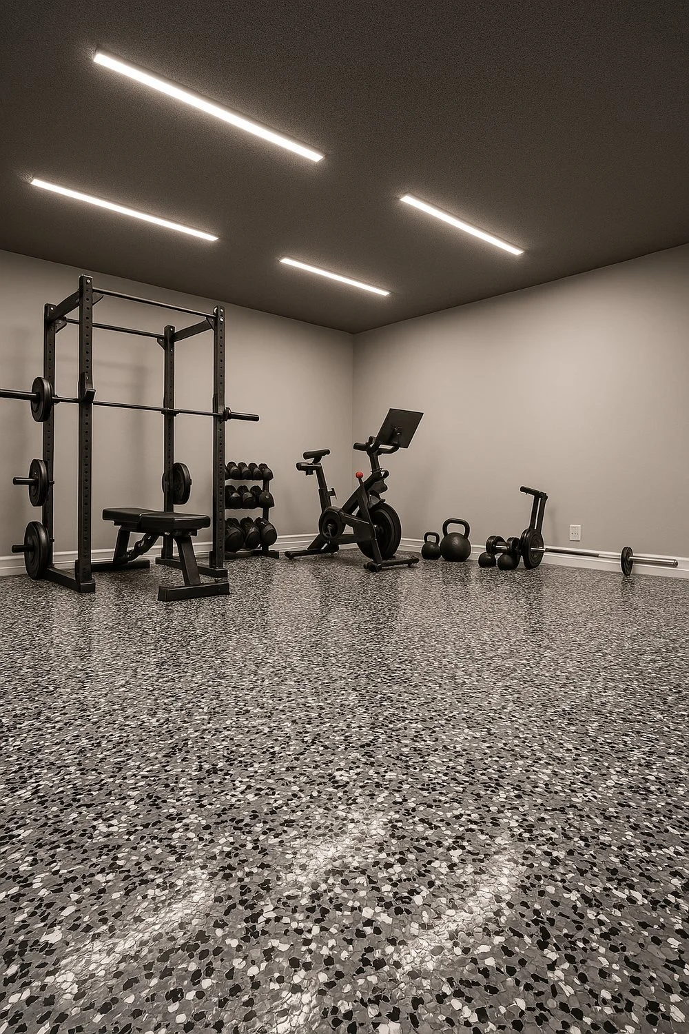 Home gyms demand a flooring surface that can handle dropped weights, equipment movement, sweat, and high-impact workouts. Epoxy flooring provides a seamless, hygienic surface that stands up to heavy training while remaining easy to clean.